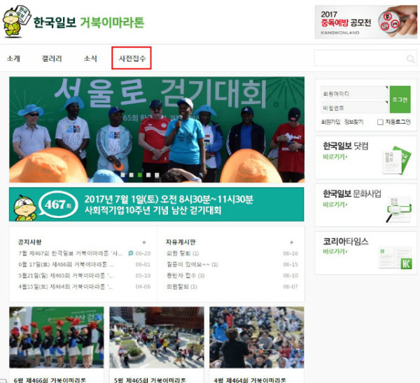 거북이마라톤 홈페이지(http://www.hkturtle.com) 접속 → 회원가입 → 로그인 → 상단 사전접수 클릭